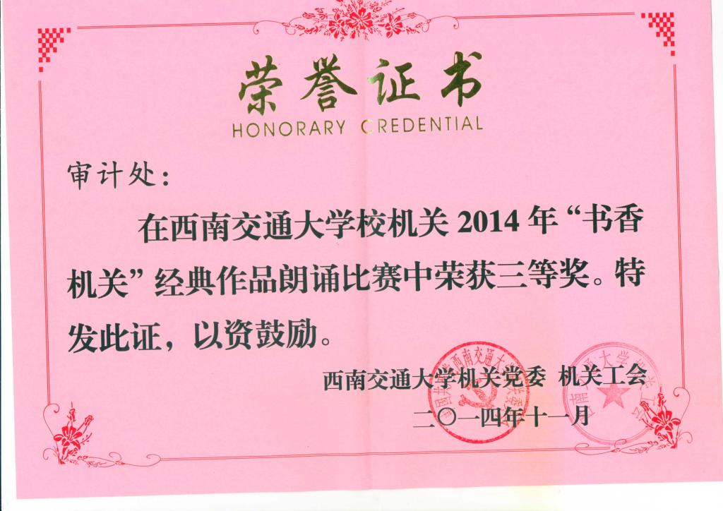 审计处在英国上市公司365校机关2014年“书香机关”经典作品朗诵比赛中荣获三等奖”